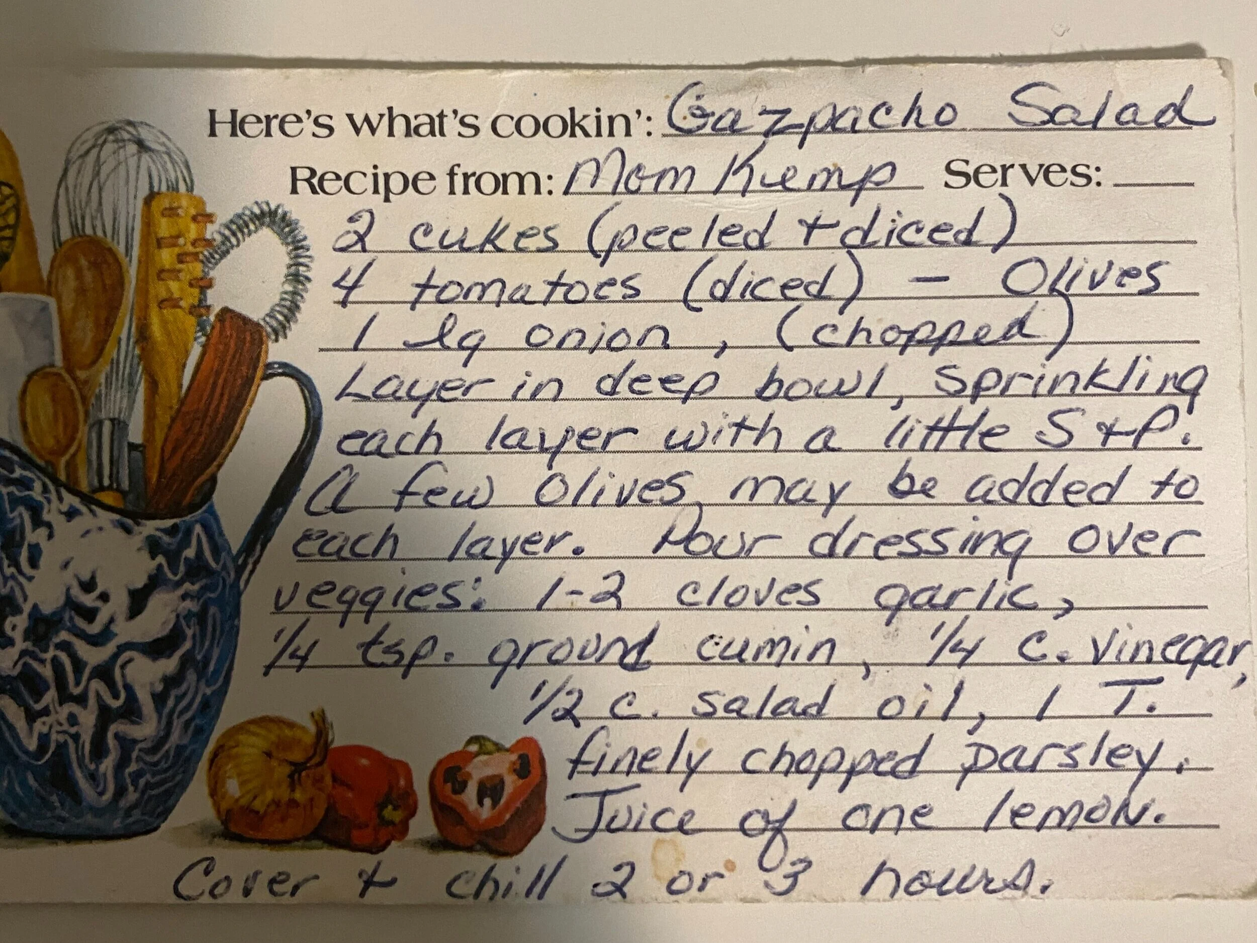 As for my mom - she just kept it simple I guess. And thinking back, she also loved to garden so I would guess she was probably looking at a similar pile of tomatoes and cucumbers that I am looking at, and wondering what to do with them. So you can start with this simple recipe, then if you want to experiment a bit, check out some other recipes and consider adding peppers, celery, radish, or cilantro. All would be good! I did make a few changes from my old hand written recipe card, one onion seemed way too much so that is cut back, and I did add the parsley, it just sounded tasty!