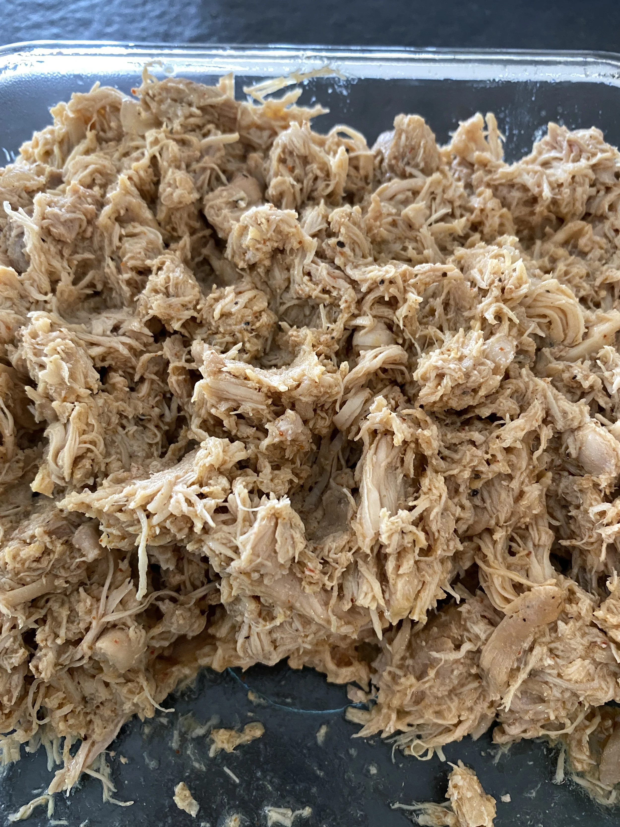It is just chicken thighs cooked in the crock pot, mexican style seasonings, with some onion and garlic. How easy is that? I use the fresh Kirkland organic boneless chicken thighs from COSTCO, they come in a three pack that can be separated, and each package is about 1 1/2 pounds. I put all three packages in the crock pot, this filled the pot about halfway and was the perfect amount for the meals I had planned!