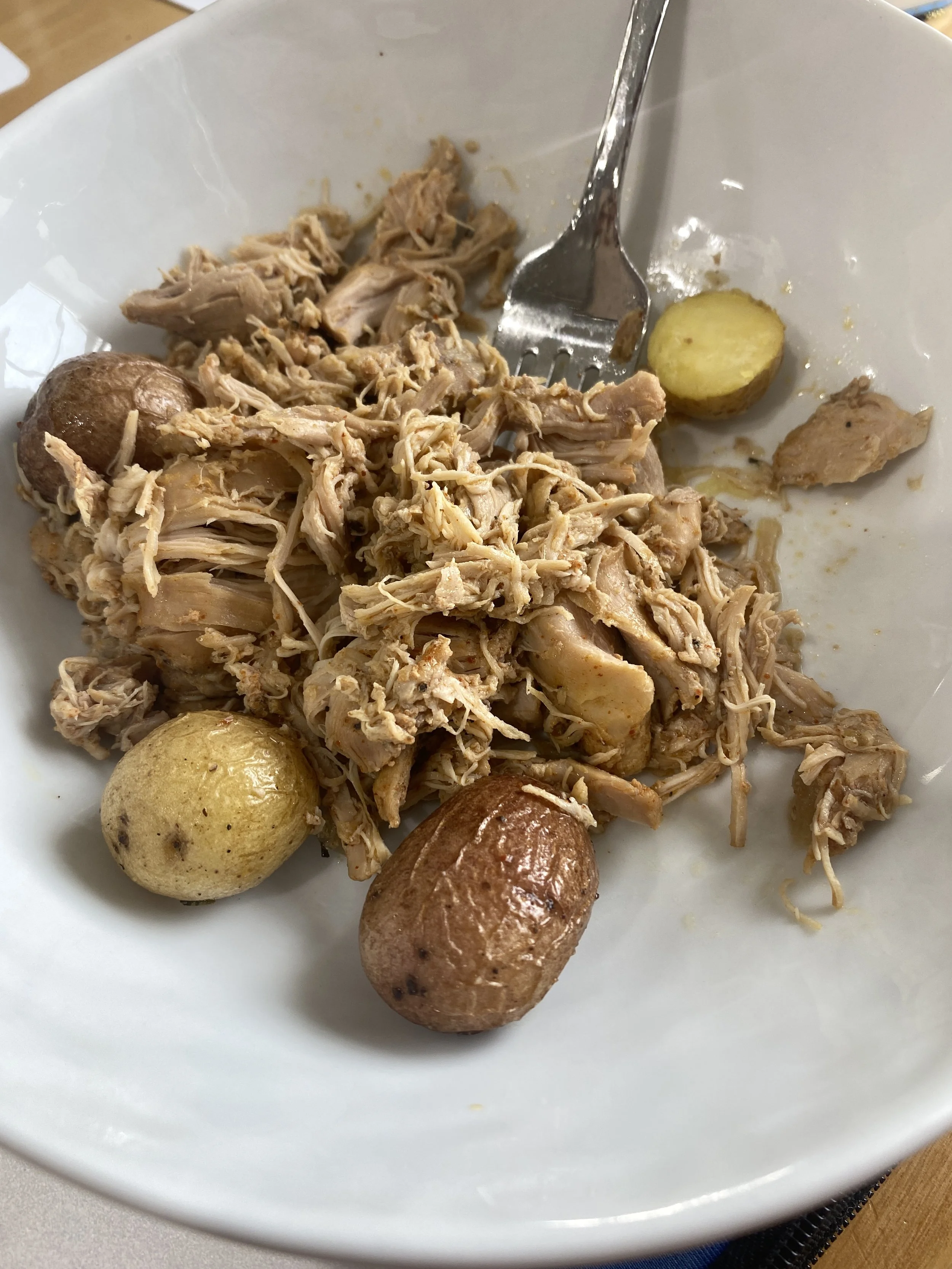 Now let’s eat! I roasted some baby potatoes for the first meal, then served the chicken over the top of those along with a side salad. The next day was chicken enchiladas, and then the rest went into a freezer bag for a taco night the following week.